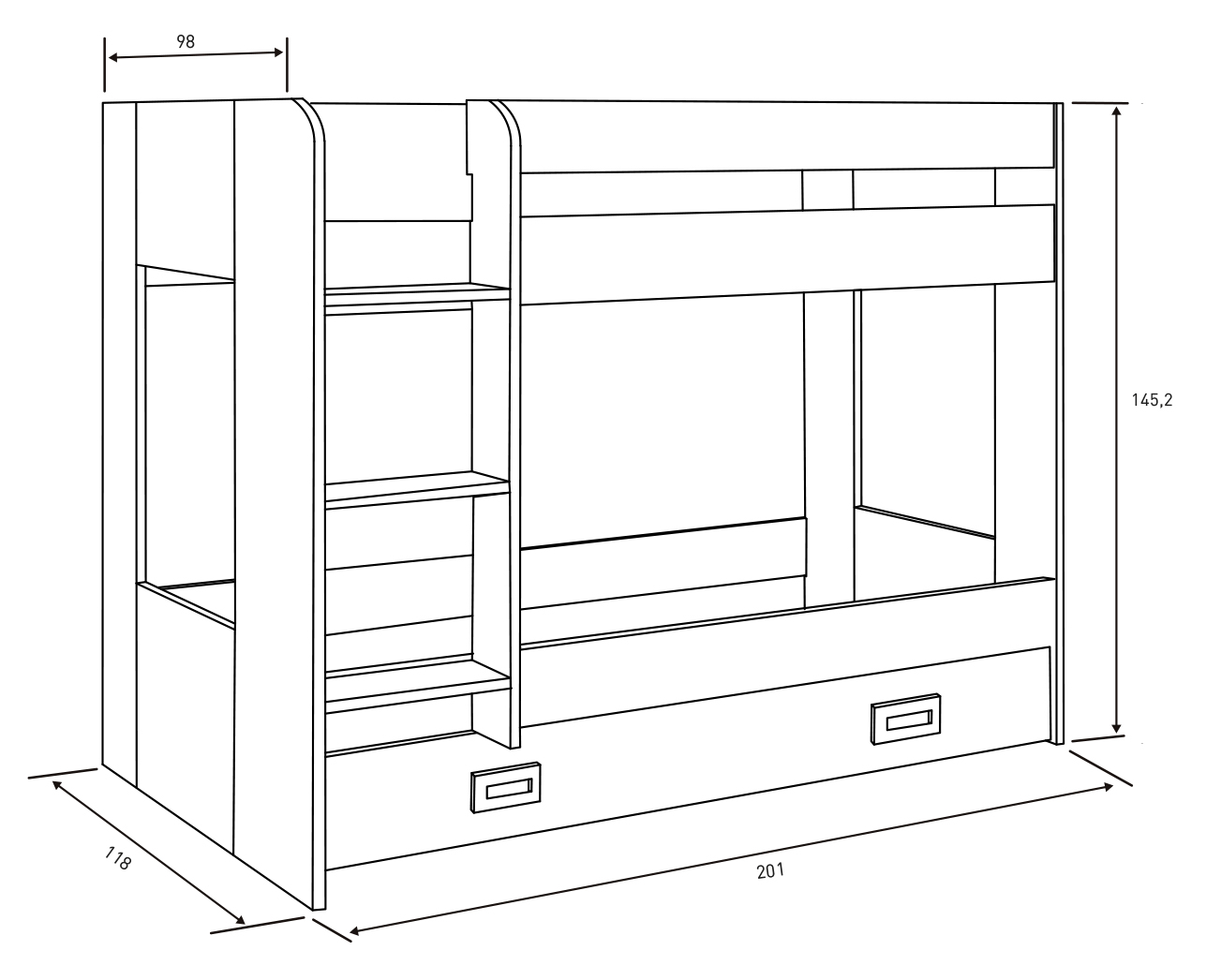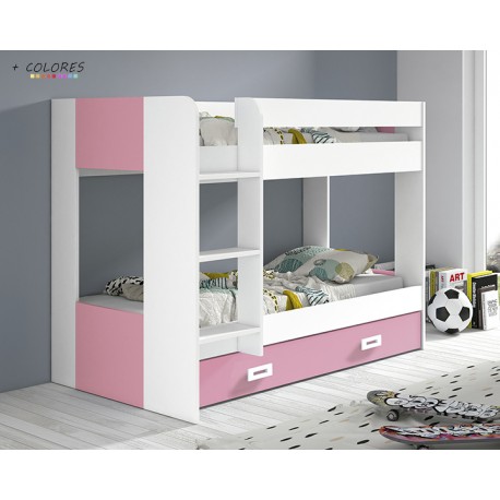 Litera para cama de 90*190 con cama nido, frente de arrastre, y escalera. No incluye somier superior, somier inferior y somier de arrastre.